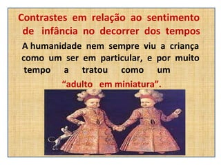 O documento descreve a evolução histórica da concepção de infância ao longo dos tempos, desde a Idade Média até a contemporaneidade. Até o século XVII, as crianças eram tratadas como adultos e não havia distinção entre as fases da vida. A partir do século XVII, reformas religiosas contribuíram para o surgimento de um sentimento de infância e maior valorização da educação e afetividade familiar. No século XX, teorias psicológicas influenciaram as concepções pedagógicas e a ONU pass