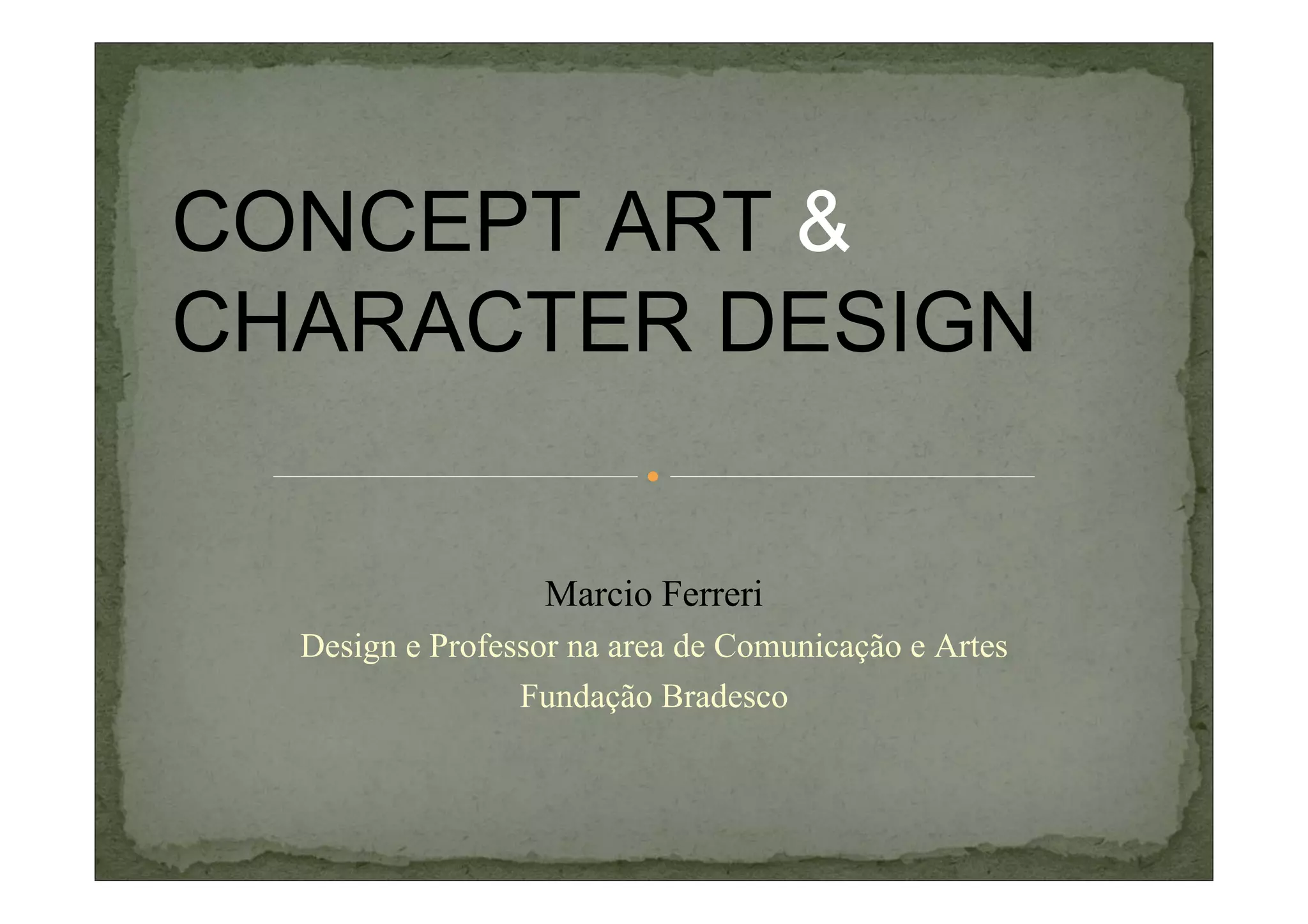 O documento discute conceitos e etapas de concept art e design de personagens, incluindo: I) conceitos gerais de concept art e character design; II) método e técnica para desenvolver um design de personagem; III) técnica de matte painting para concept art. Também fornece exemplos de briefings, fichas de personagens, estilos visuais e guides de estilo.