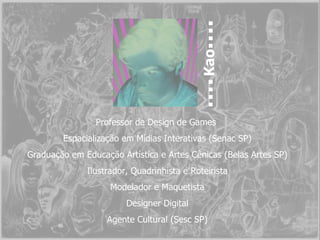 Kao Professor deDesign de Games Espacialização em Mídias Interativas (Senac SP) Graduação em Educação Artística e Artes Cênicas (Belas Artes SP) Ilustrador, Quadrinhista e Roteirista Modelador e Maquetista Designer Digital Agente Cultural (Sesc SP)