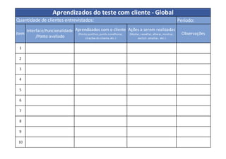 Este documento fornece instruções sobre como realizar um Concept Sprint, que é um processo de cinco etapas para a criação ou teste de um conceito utilizando design thinking. As cinco etapas são: Entender, Idear, Alinhar, Prototipar e Testar. Inicialmente, o desafio é definido e as etapas incluem entrevistas com clientes, geração de ideias individuais e em grupo, seleção de ideias e desenvolvimento de protótipos para teste.