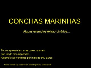 O documento lista diversas espécies de conchas marinhas raras, com algumas sendo vendidas por preços exorbitantes, como até 3 milhões de euros por uma concha com imagens de uma pomba e rosto feminino. A coleção inclui exemplos coloridos de conchas de diversos tamanhos e formas de todo o mundo.