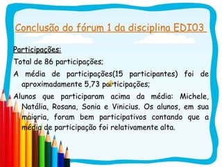 O documento discute as conclusões do fórum 1 da disciplina EDI03. Os alunos participaram ativamente, com média de 5,73 participações por pessoa. Ferramentas como fóruns e chats foram analisadas, identificando vantagens como flexibilidade e construção colaborativa, mas também desafios como falta de foco e dificuldades técnicas.