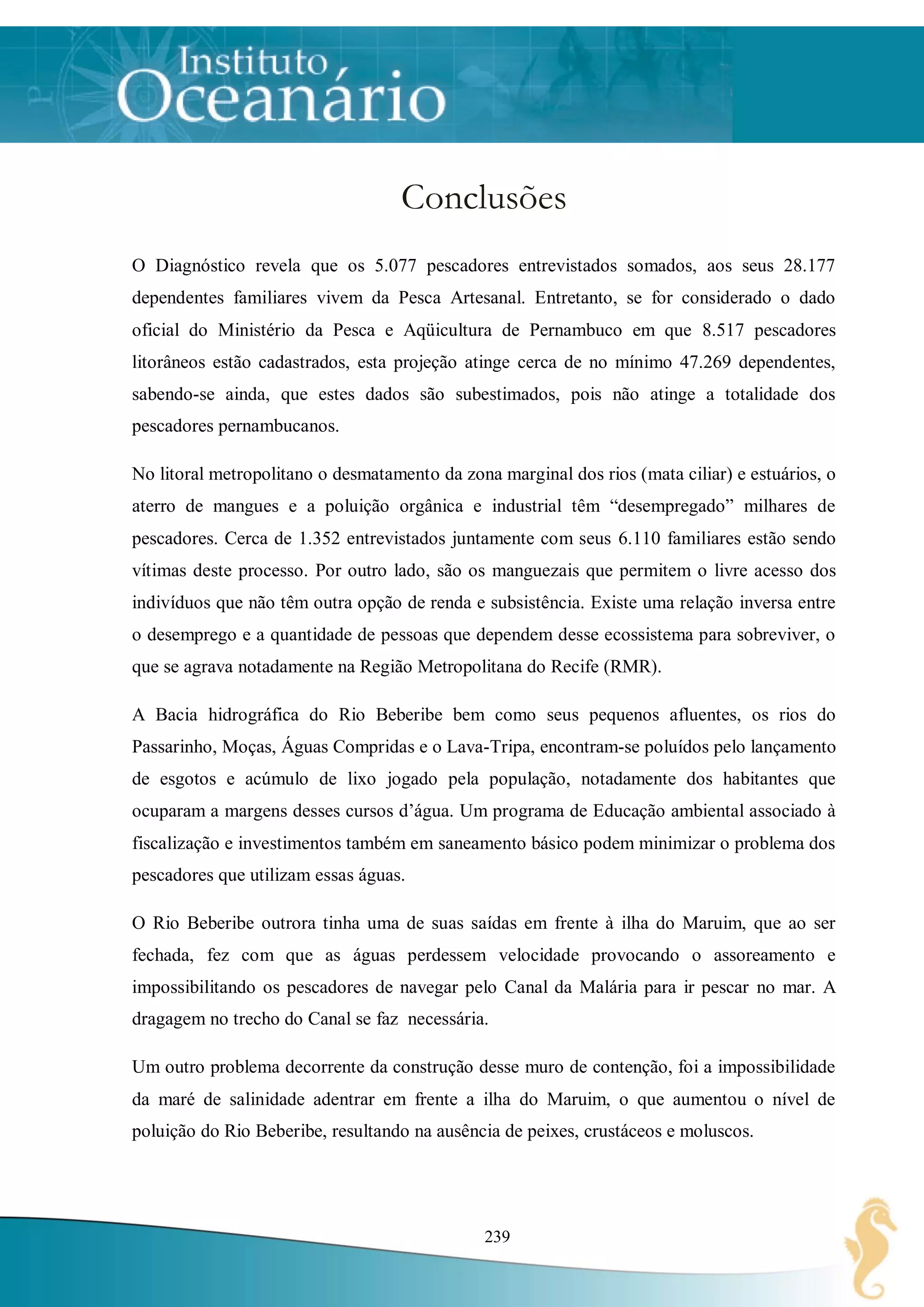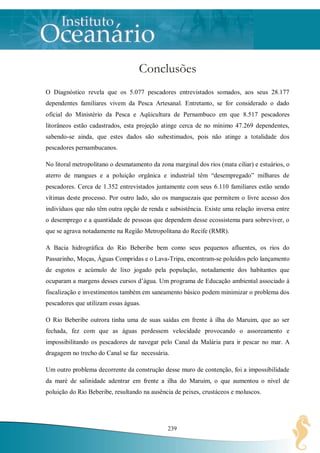 O documento discute os problemas enfrentados por pescadores no litoral de Pernambuco, incluindo poluição, degradação ambiental, falta de saneamento e educação ambiental inadequada. Ele propõe várias intervenções como programas de educação ambiental, dragagem de canais, gestão costeira integrada e apoio às comunidades pesqueiras.
