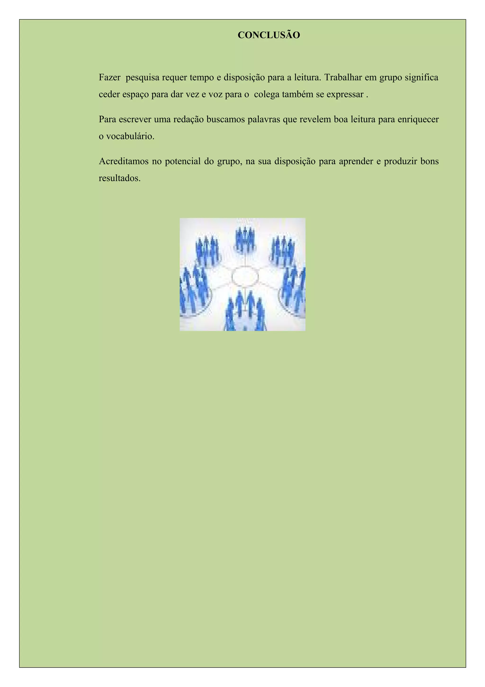 Fazer pesquisa requer tempo e esforço. Trabalhar em grupo significa dar espaço para os outros também se expressarem. Acreditamos no potencial do grupo para aprender e produzir bons resultados através da leitura e do enriquecimento do vocabulário.