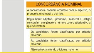 O documento discute as regras de concordância nominal e verbal no português. A concordância nominal acontece entre substantivos e seus adjuntos, como adjetivos, artigos e pronomes. Já a concordância verbal ocorre entre o verbo e seu sujeito. O texto explica detalhadamente os casos em que esses elementos gramaticais devem concordar em gênero, número e pessoa.