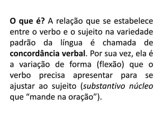 O documento explica os conceitos de concordância verbal e como o verbo deve concordar com o sujeito na língua portuguesa. A concordância evita a repetição do sujeito através da flexão verbal. Exemplos mostram como o verbo deve concordar com sujeitos simples, compostos e quando usado com o pronome "se".
