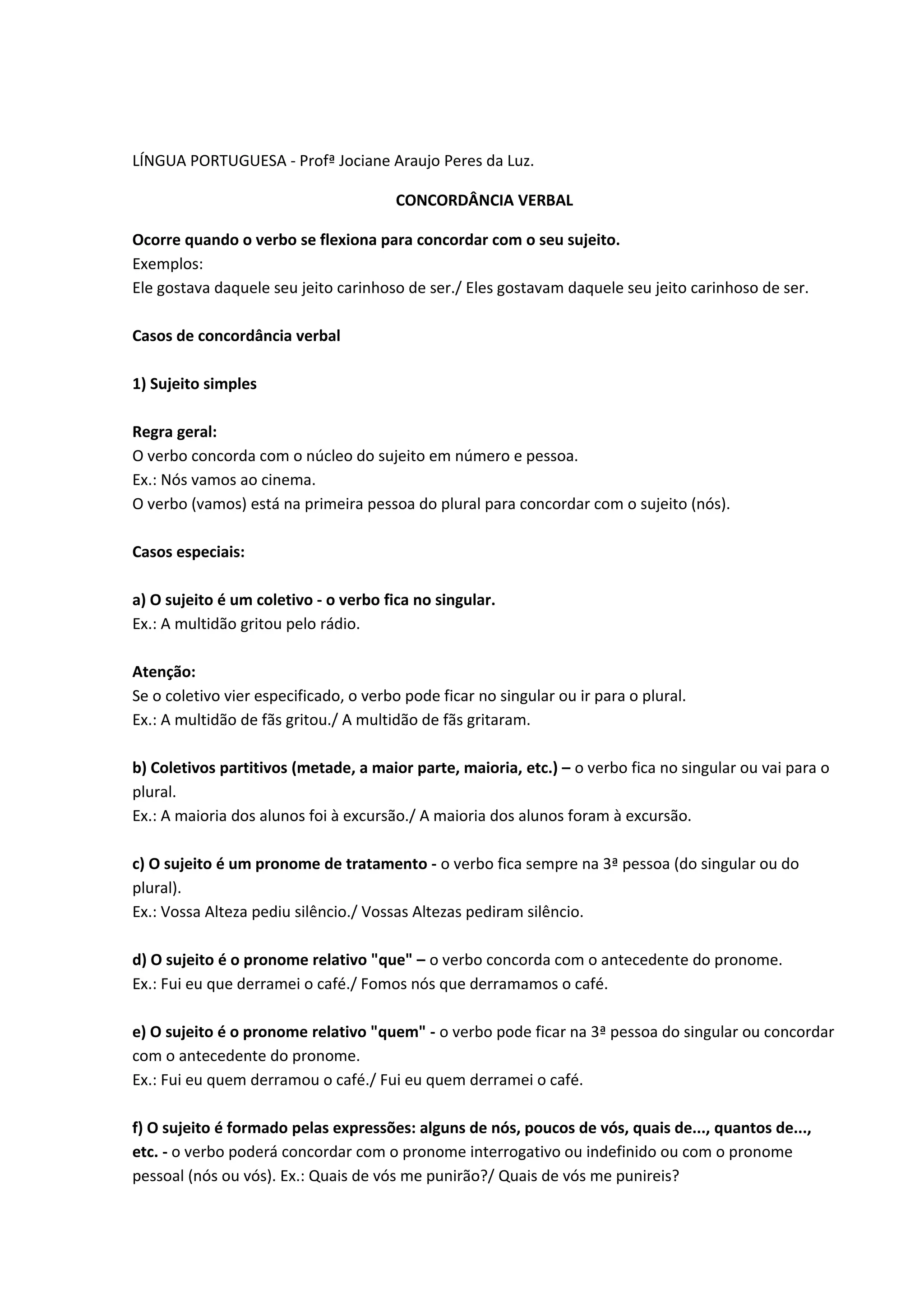 O documento discute as regras de concordância verbal em português. Apresenta casos de concordância com sujeitos simples e compostos, e com verbos como ser, dar e parecer. Fornece exemplos detalhados sobre como o verbo deve concordar com diferentes tipos de sujeitos, como coletivos, pronomes e orações subordinadas.