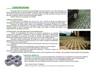 Concregrama são peças de concreto para pavimentação que são preenchidas com grama, proporcionando um piso permeável e drenante. São produzidos em fábricas em Curitiba e requerem limpeza anual com escova e detergente para manter a durabilidade.