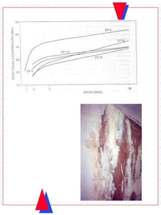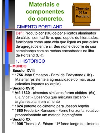O documento aborda o programa da disciplina de Concreto e Argamassas, detalhando desde os materiais e componentes do concreto até os diferentes tipos e classes de cimento. Ele explora a história da fabricação de cimento, suas propriedades, o processo de hidratação e a influência de adições pozolânicas. Além disso, é apresentado um resumo das características químicas e físicas do cimento Portland e suas interações com diferentes componentes.