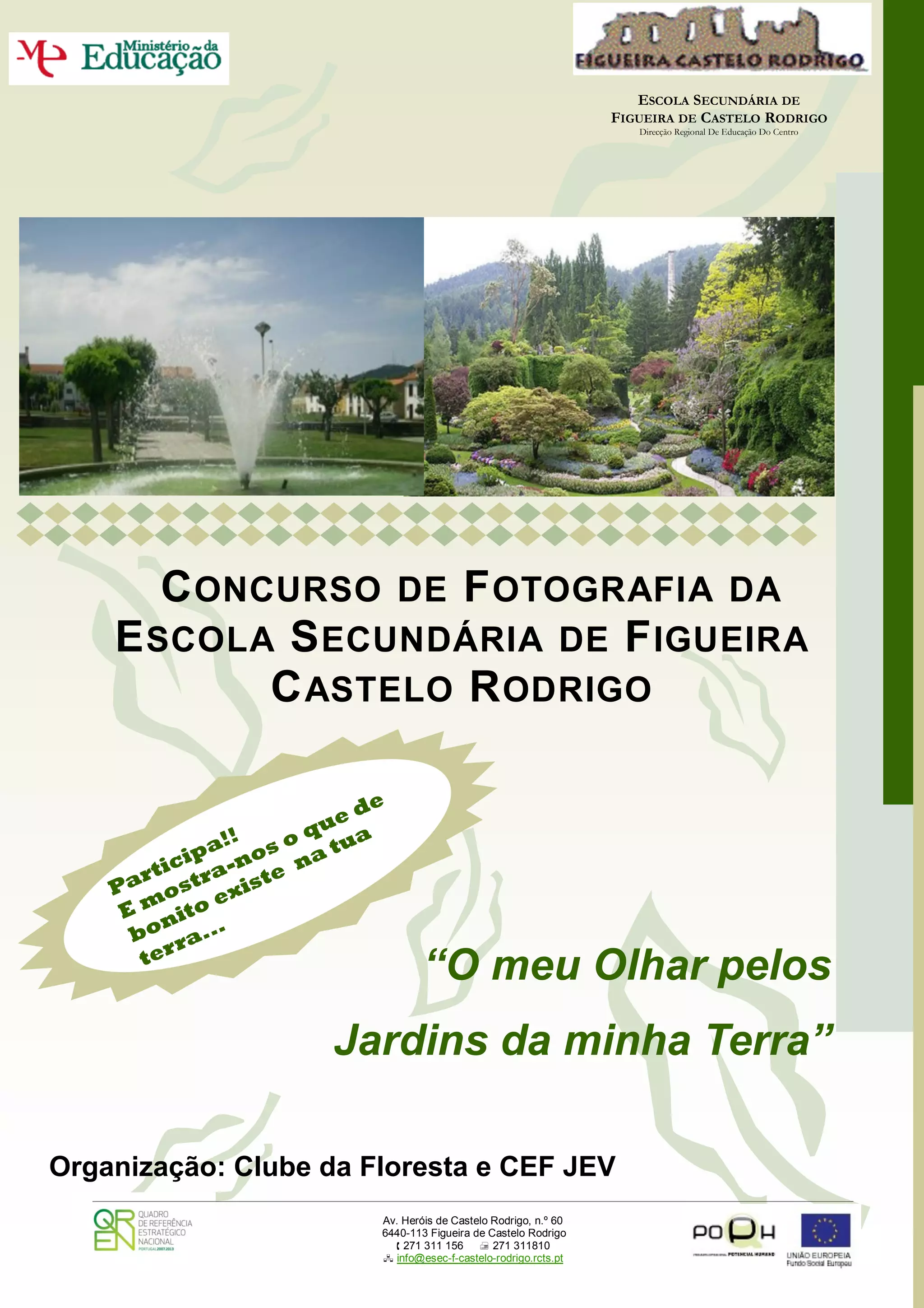 Este documento anuncia um concurso de fotografia organizado por uma escola secundária com o tema "O meu Olhar pelos jardins da minha Terra". Contém informações sobre como se inscrever no concurso e o formulário de inscrição para preencher com dados pessoais e detalhes sobre a fotografia submetida.