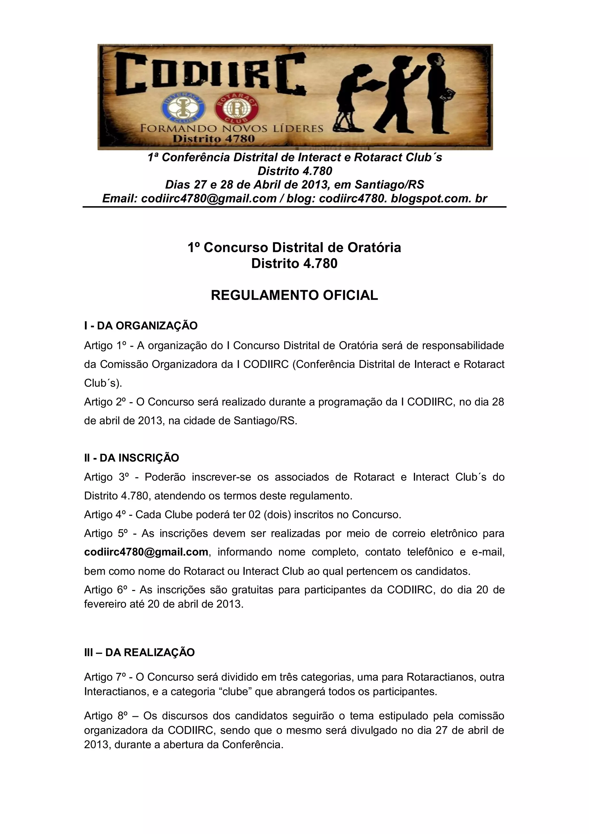 Este documento apresenta o regulamento oficial do 1o Concurso Distrital de Oratória do Distrito 4.780, que será realizado durante a 1a Conferência Distrital de Interact e Rotaract Club's em 28 de abril de 2013. O regulamento descreve as regras para inscrição, categorias, apresentação, julgamento, pontuação e premiação dos participantes.