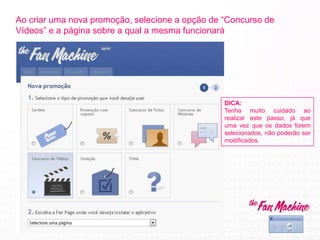 Este manual fornece instruções sobre como configurar um concurso de vídeos em uma página do Facebook, incluindo como selecionar a opção de concurso de vídeos, configurar os detalhes gerais da promoção, criar um formulário de registro, definir informações de participação e personalizar mensagens. Oferece várias dicas, como incentivar a participação e viralização, dividir o concurso em etapas de participação e votação, e garantir que a política de privacidade e termos estejam de acordo com a marca.