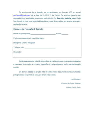 O projeto visa treinar os alunos a observarem a presença do sagrado na história, no cotidiano e na natureza através de fotografias. Os alunos poderão enviar até duas fotos para cada uma das três categorias e a escola premiará as melhores fotos de cada categoria. O projeto é obrigatório para os alunos do 2o ano e facultativo para os demais.