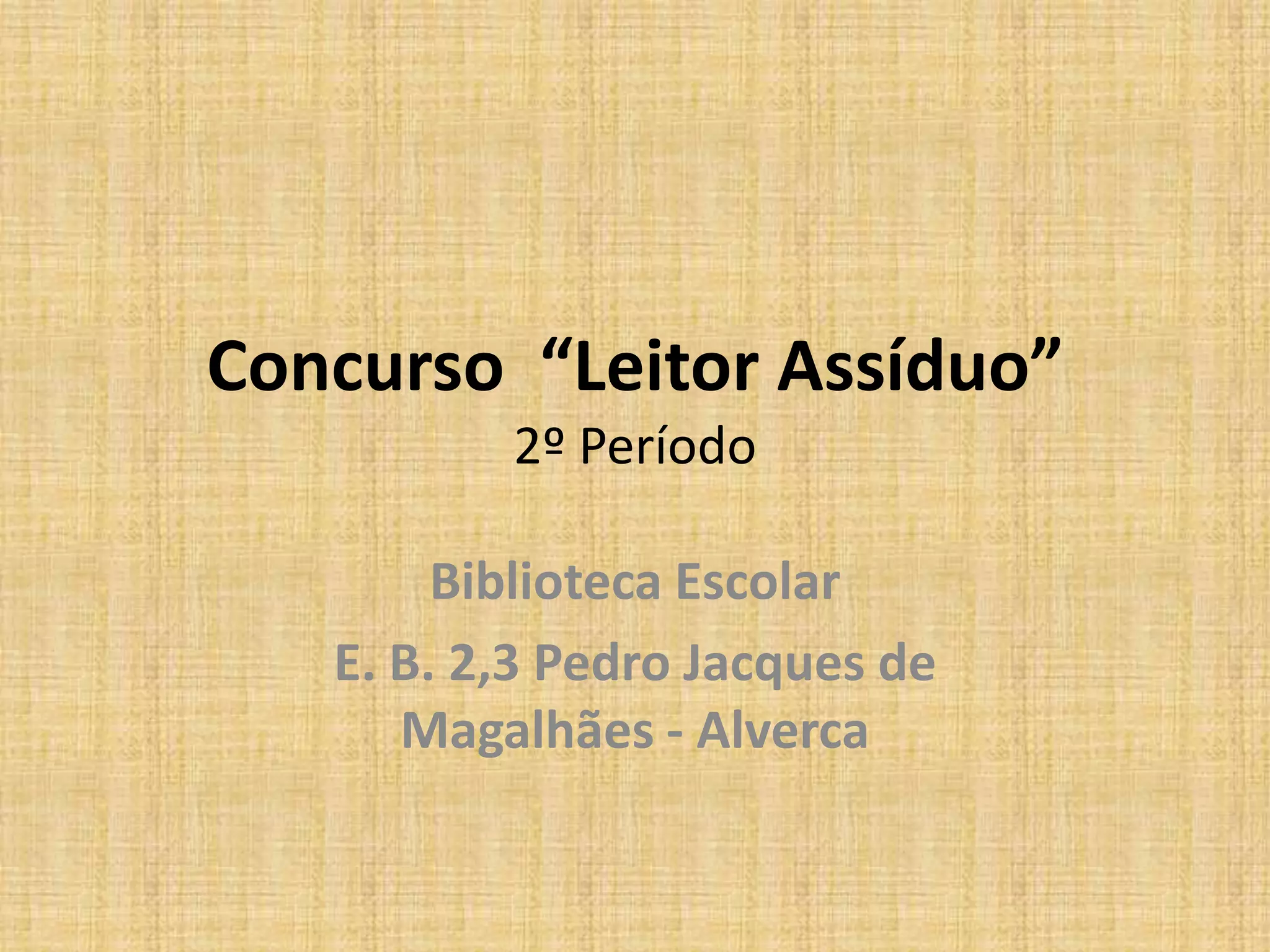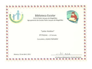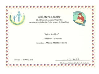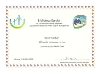 A Maiara recebeu o 1o Prémio "Leitor Assíduo" do 2o período na Biblioteca Escolar E. B. 2,3 Pedro Jacques de Magalhães - Alverca. A professora Luísa Leite entregou o 2o Prémio ao Vasco. A Joana recebeu o 3o Prémio e o João Pedro Dias obteve o 1o Prémio de "Leitor Assíduo" do 3o ciclo.