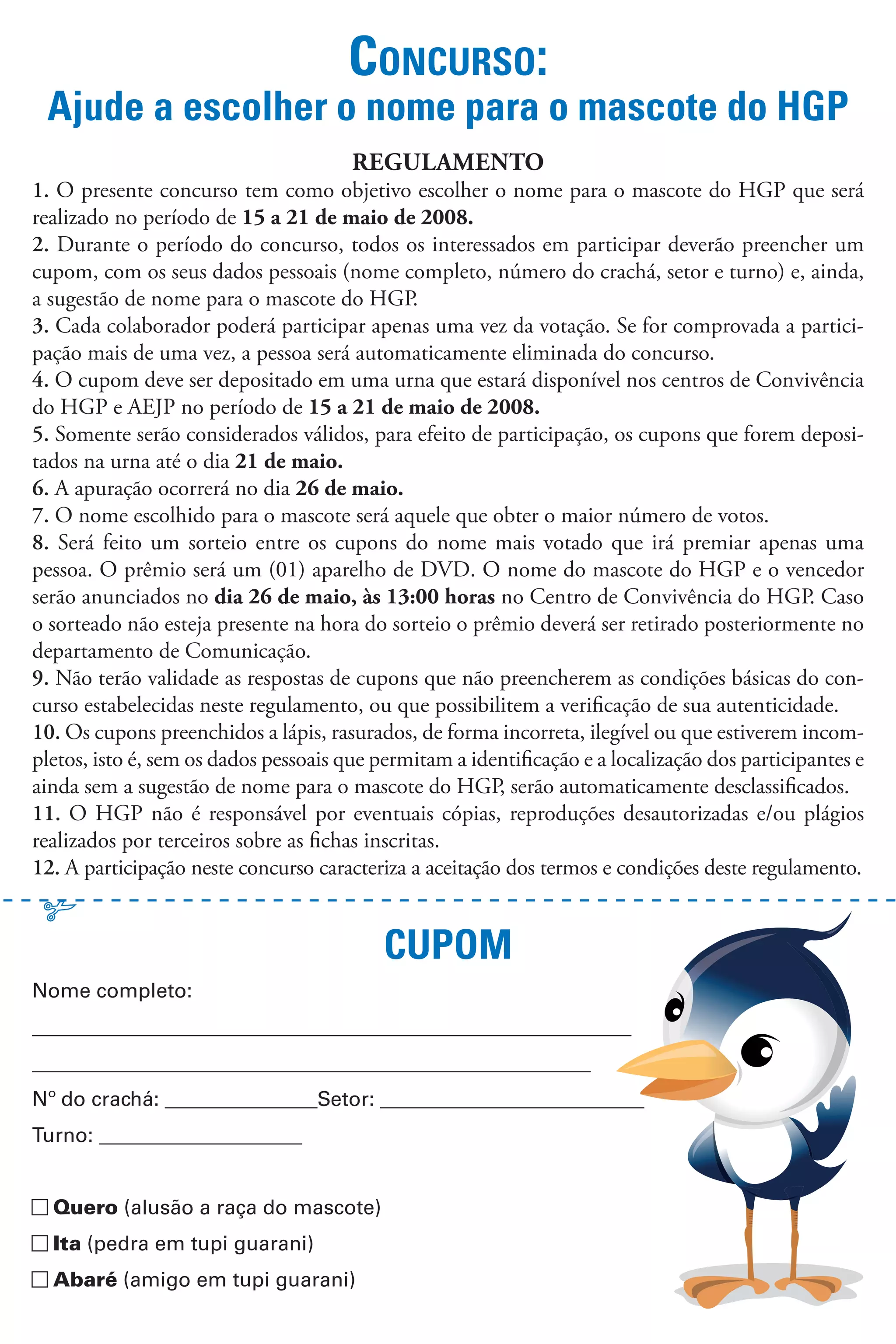 O documento descreve um concurso para escolher o nome do mascote do HGP, no qual os funcionários podem sugerir nomes depositando cupons em urnas entre os dias 15 e 21 de maio de 2008. O nome mais votado vencerá e haverá um sorteio de um DVD entre os que sugeriram esse nome.