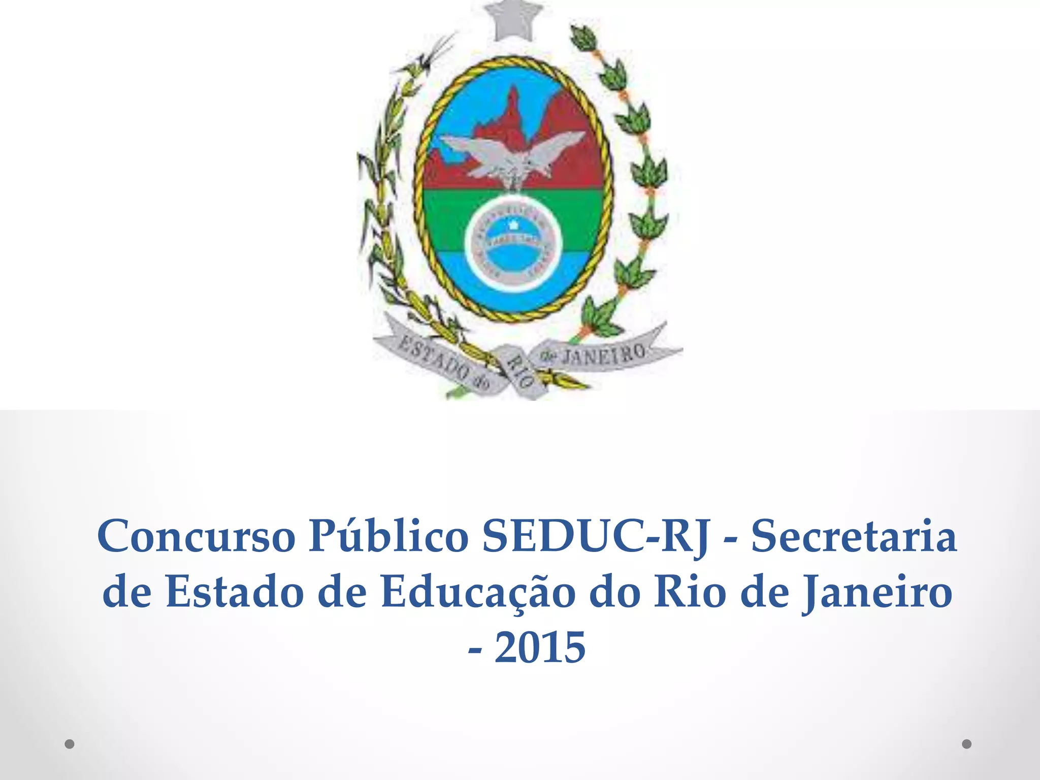O documento resume um concurso público da Secretaria de Educação do Rio de Janeiro em 2015, com 1697 vagas cujos salários variam até R$2211,25. As inscrições poderiam ser feitas até 1o de fevereiro de 2014 no site listado, com taxas entre R$50-70. A prova seria em 8 de março.