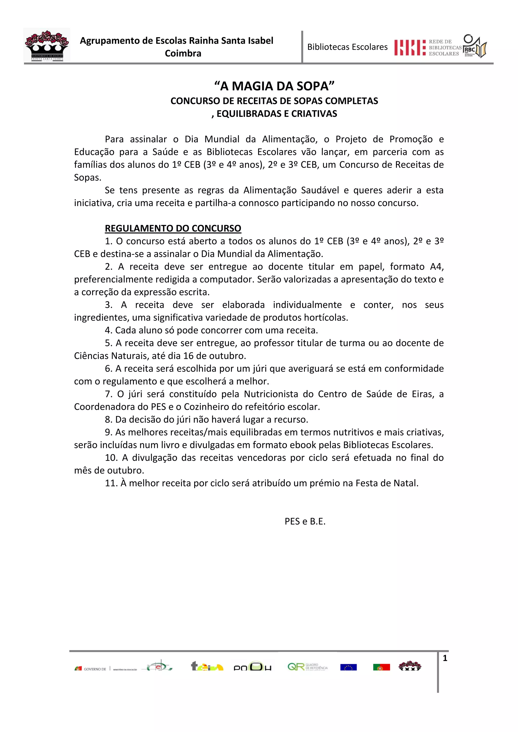 O documento anuncia um concurso de receitas de sopa para assinalar o Dia Mundial da Alimentação. As regras estabelecem que o concurso é aberto a alunos de 3o a 9o ano e que as receitas devem conter produtos hortícolas e ser entregues até 16 de outubro, sendo avaliadas por um júri. As melhores receitas serão publicadas e premiadas.
