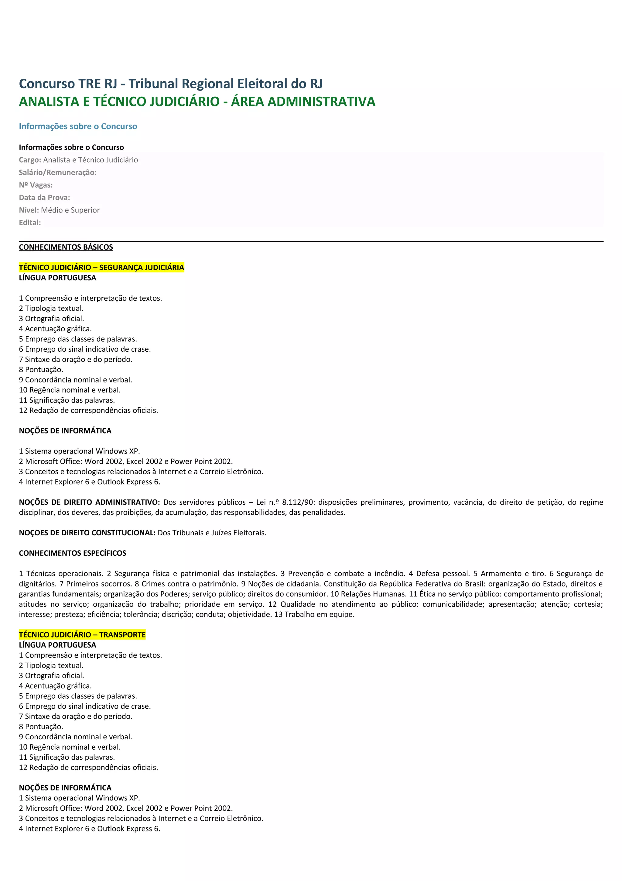 O documento fornece informações sobre um concurso público para Analista e Técnico Judiciário no Tribunal Regional Eleitoral do Rio de Janeiro, incluindo cargos, salários, datas da prova, nível de escolaridade requerido, conhecimentos básicos e específicos de acordo com cada cargo.