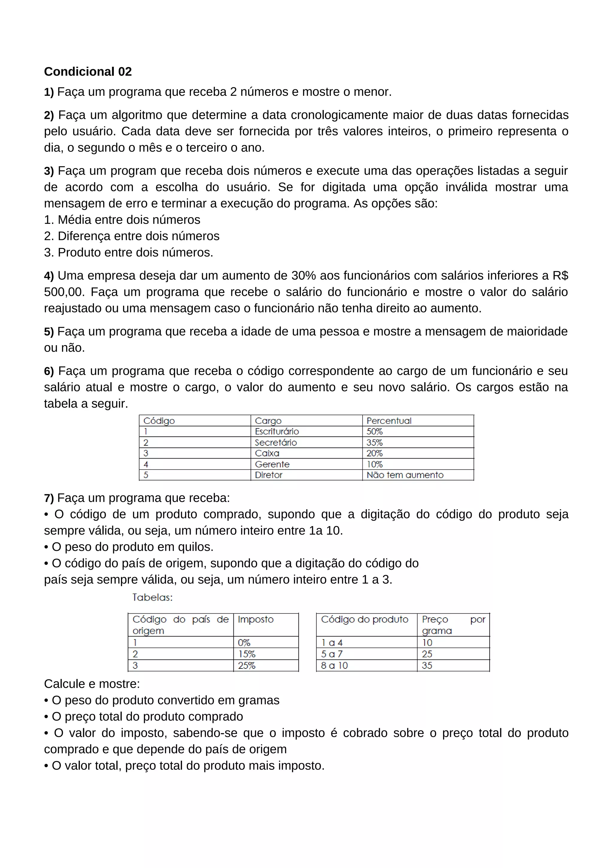 O documento apresenta 7 problemas de programação que envolvem receber dados de entrada e realizar cálculos e comparações. Os problemas incluem mostrar o menor de 2 números, determinar a data mais recente, executar operações matemáticas baseadas na escolha do usuário, calcular reajuste salarial, verificar maioridade, calcular aumento e novo salário baseado no cargo, e calcular peso, preço, imposto e valor total de um produto com base em seus dados e país de origem.