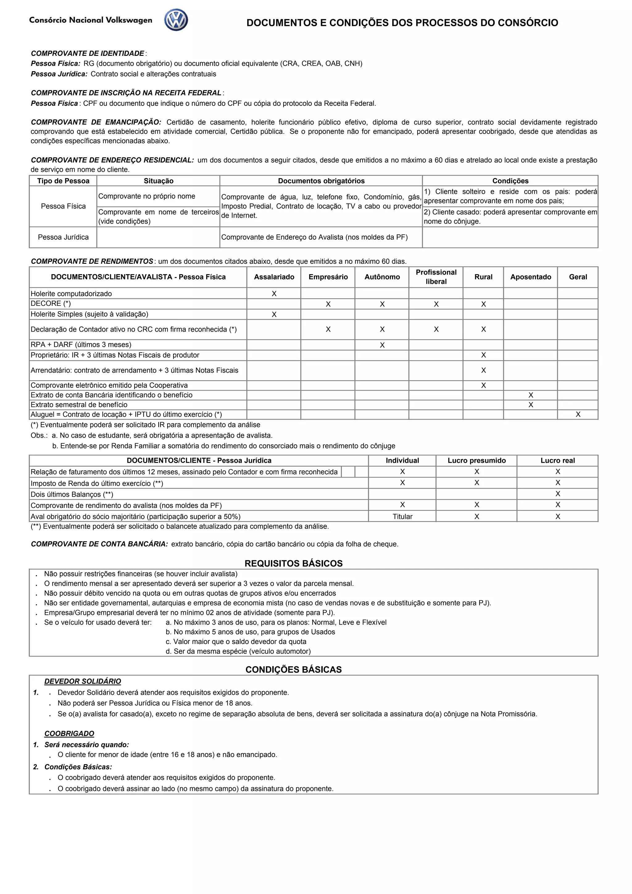 O documento lista os requisitos e documentos necessários para processos de consórcio. São necessários comprovantes de identidade, inscrição na receita federal, endereço, rendimentos e conta bancária. Também são detalhadas as condições para devedores solidários, coobrigados e requisitos básicos.