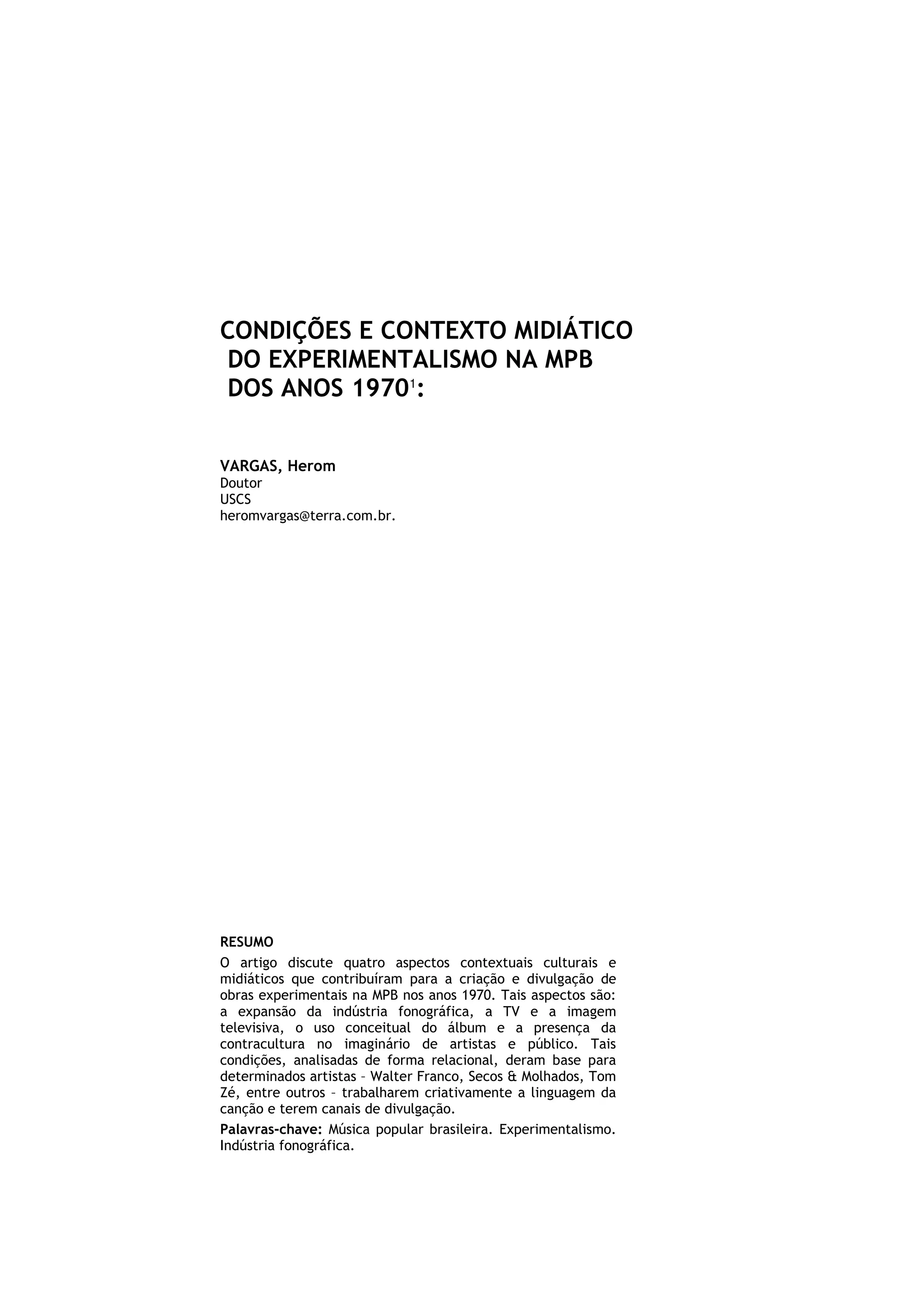 O documento discute como as condições midiáticas e culturais dos anos 1970, como o crescimento da indústria fonográfica, a televisão, o álbum conceitual e a contracultura, criaram um ambiente que permitiu a criação e divulgação de obras experimentais na MPB durante essa década, como as de Walter Franco, Secos & Molhados e Tom Zé.