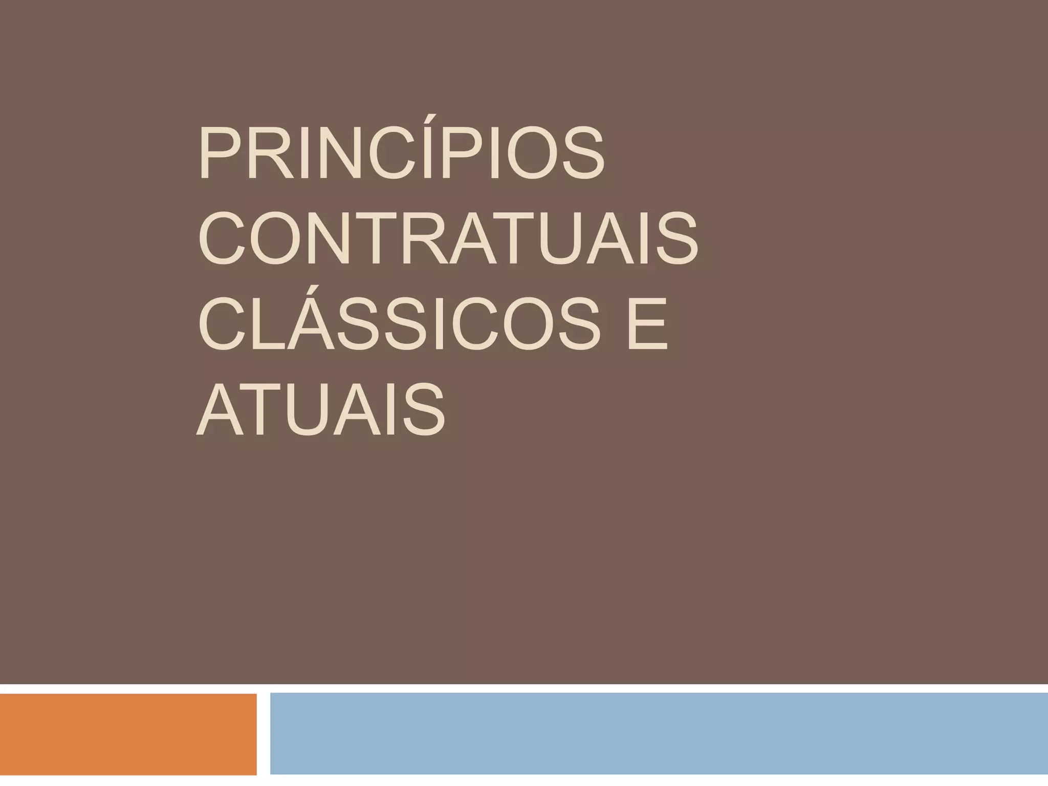 O documento discute os principais princípios contratuais clássicos e atuais. Os principais princípios clássicos incluem a autonomia da vontade, a supremacia da ordem pública, a força obrigatória e o consensualismo. Os principais princípios atuais incluem a função social, a revisão por onerosidade excessiva e a boa-fé objetiva.
