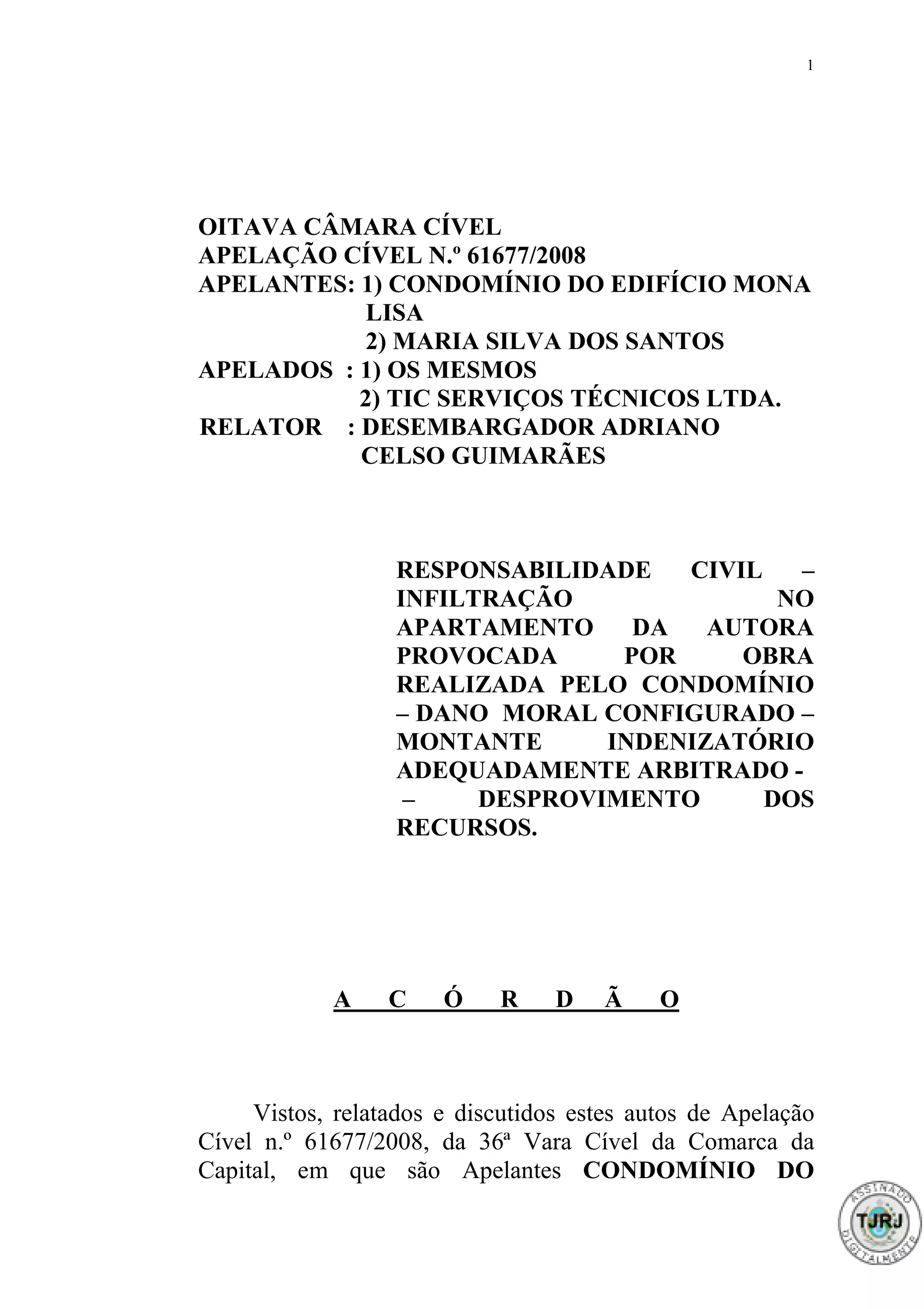 1) Uma moradora moveu ação contra o condomínio e a empresa responsável por obras realizadas no prédio após sofrer danos causados por infiltrações durante as obras.