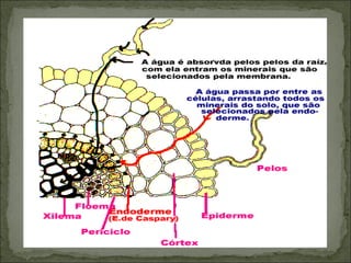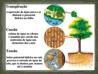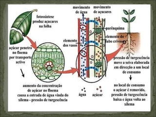 O documento descreve os processos de absorção de água e nutrientes minerais pelas raízes das plantas, transporte de seiva bruta e elaborada através do xilema e floema, fotossíntese realizada nas folhas que converte a energia luminosa em energia química na forma de glicose, e respiração celular que libera energia a partir da glicose nos mitocôndrios.
