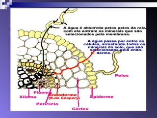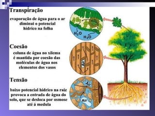 O documento resume os principais tópicos da fisiologia vegetal, incluindo a absorção e condução de água e sais minerais pela raiz e xilema, a produção e transporte de seiva elaborada pelo floema, a gutação, o modelo de Münch, a fotossíntese e sua divisão em fases clara e escura, os fatores que afetam a fotossíntese, a quimiossíntese e a respiração celular nas plantas.