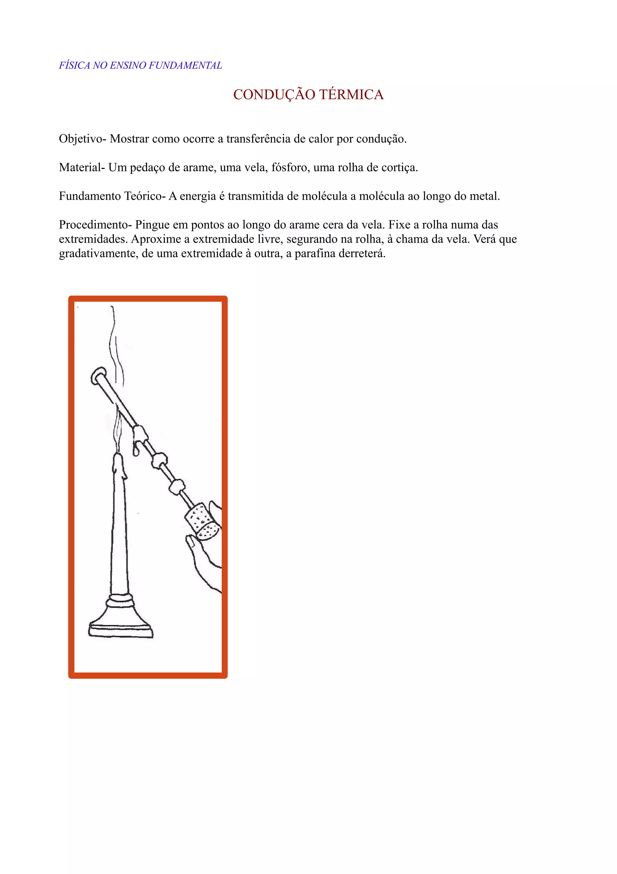 O documento descreve um experimento para mostrar a condução térmica, no qual cera de vela é derretida gradualmente ao longo de um arame quando uma extremidade é aquecida por uma chama, demonstrando como o calor é transmitido de molécula para molécula através do metal.