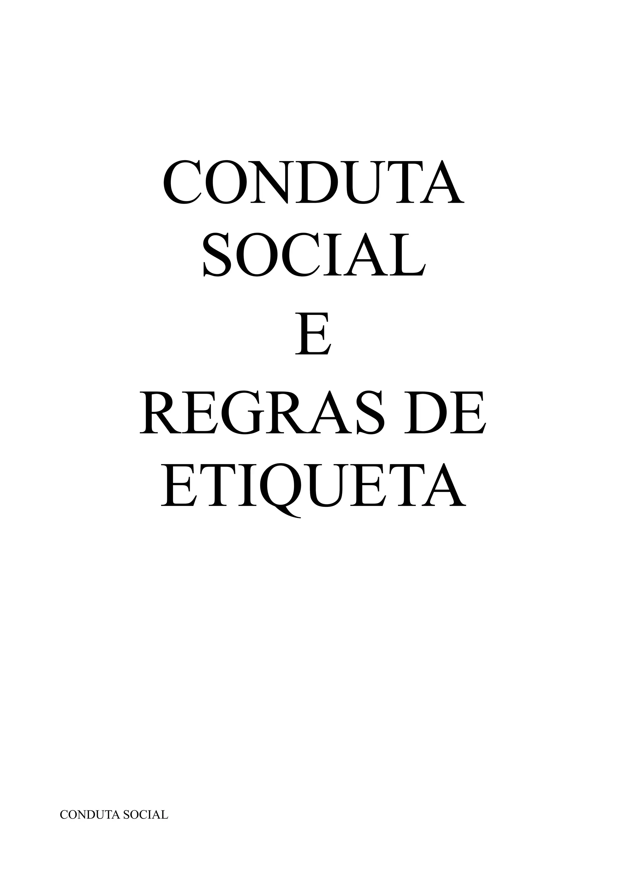 O documento discute regras de conduta social e etiqueta. Apresenta os componentes da conduta social, incluindo aspectos verbais, para-verbais e não verbais da comunicação. Também descreve regras de etiqueta para situações como vestimenta, cumprimentos e comportamento à mesa.