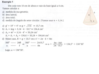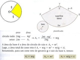 O documento descreve as características geométricas de um cone, incluindo sua altura, raio da base, eixo de rotação e seção meridiana. Ele também fornece fórmulas para calcular a área da base, a área lateral e o volume de um cone.