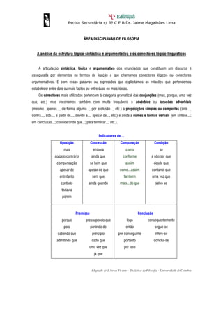 O documento discute os conectores lógicos e linguísticos que conectam enunciados em um discurso. Ele fornece uma lista de conectores comuns de oposição, concessão, comparação, condição, premissa e conclusão e explica como eles explicitam as relações entre fatos e ideias.