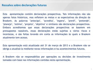 1) A Braskem apresentou seus resultados do primeiro trimestre de 2013, com destaque para o crescimento de 6% nas vendas de resinas, taxa média de utilização dos crackers de 90% e EBITDA de R$937 milhões.