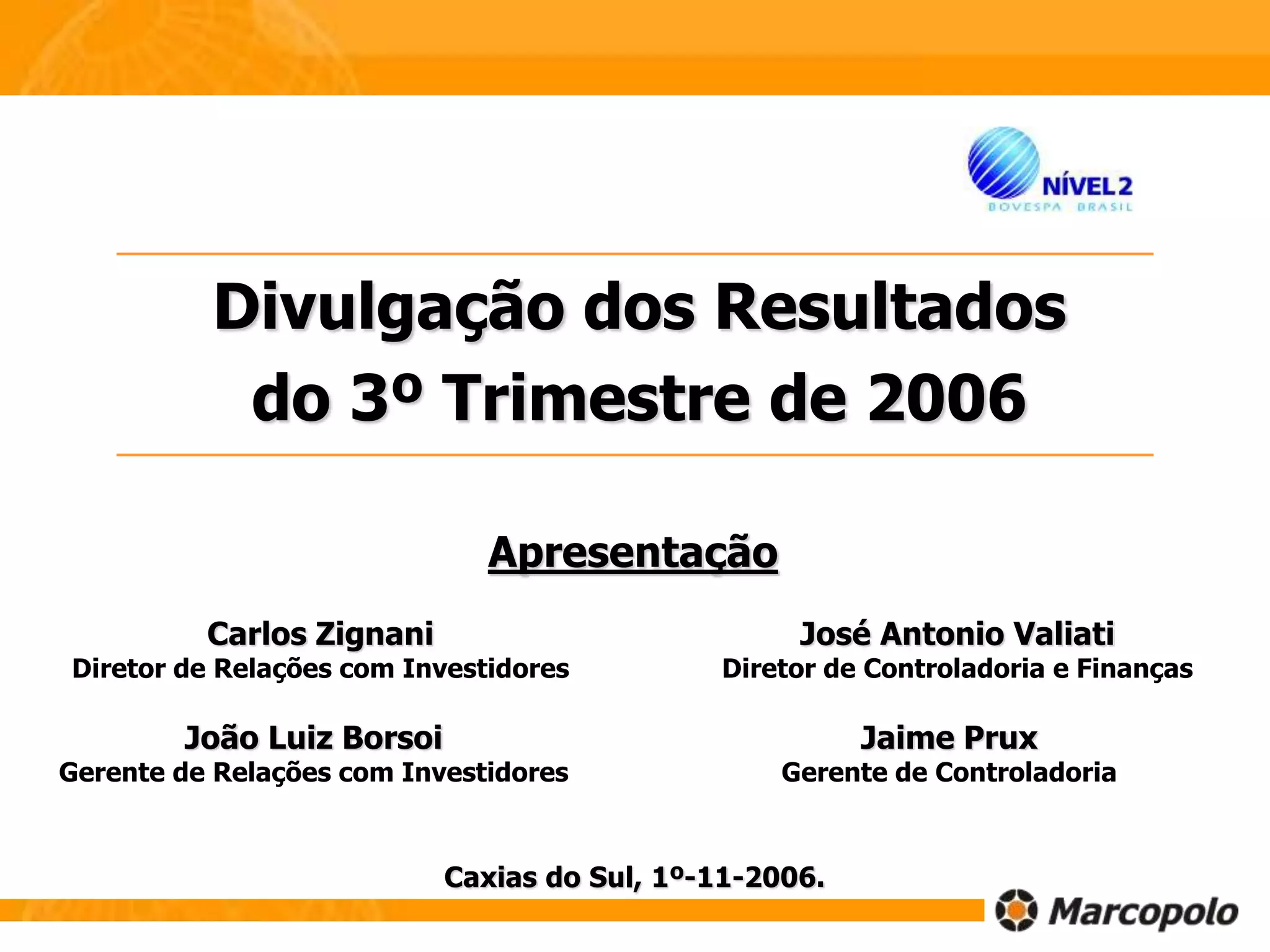 O documento apresenta os resultados financeiros da Marcopolo no 3o trimestre de 2006. Os destaques positivos foram as altas margens de lucro e a melhora da posição financeira. Os negativos foram a produção abaixo do esperado e receita aquém do planejado. Apresenta também projeções para o 4o trimestre de 2006 e cenários para 2007, incluindo novas operações na Rússia e Índia.