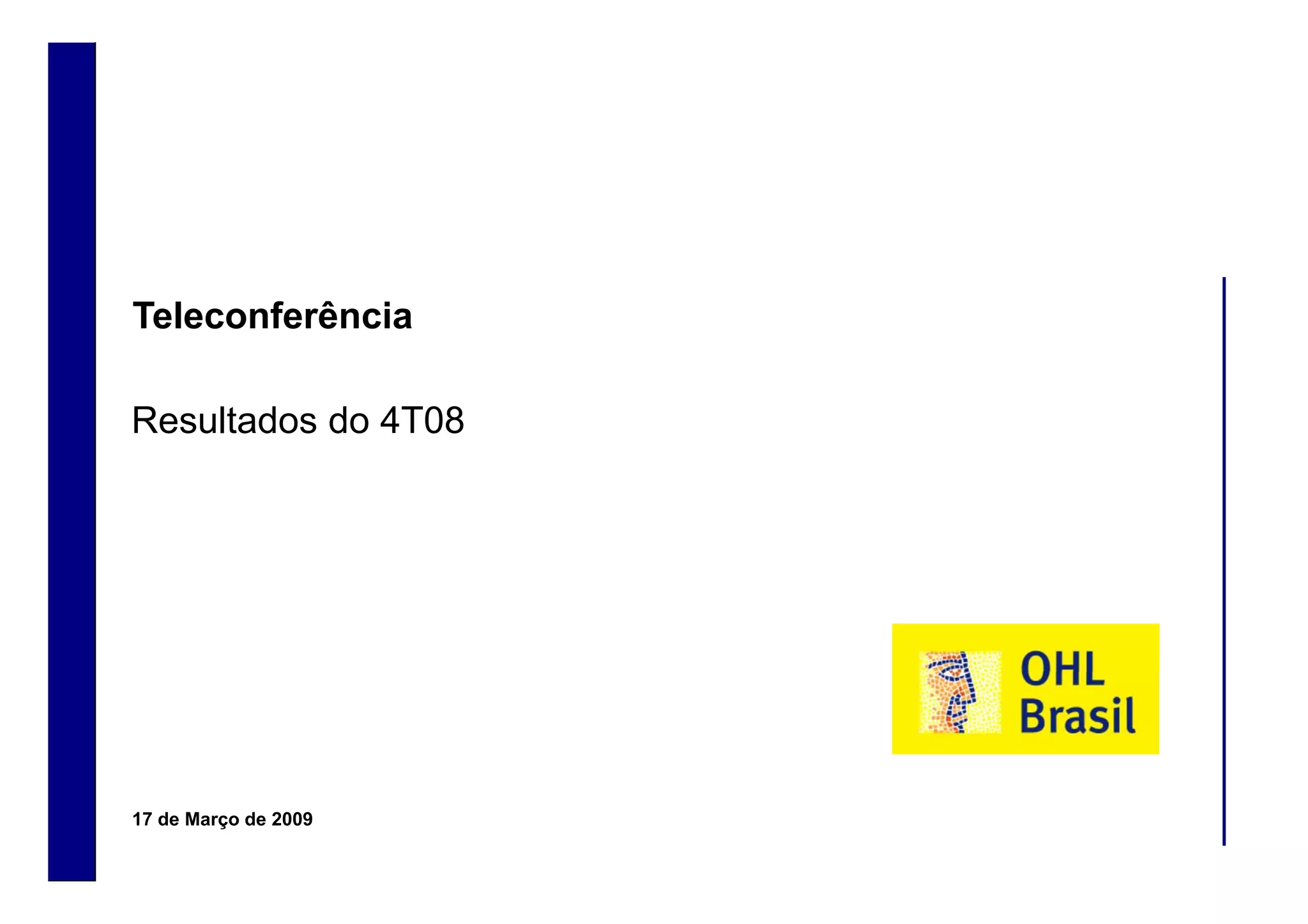 1) A OHL Brasil apresentou um crescimento de tráfego de 2,6% no 4T08 e um EBITDA Ajustado de R$126,5 milhões, 21% maior que no mesmo período do ano anterior. 2) As tarifas de pedágio das concessionárias estaduais tiveram um reajuste de 11,53% em julho de 2008 e a tarifa média total aumentou 12,7% no 4T08 comparado ao mesmo período do ano anterior. 3) Em dezembro de 2008, entraram em operação 5