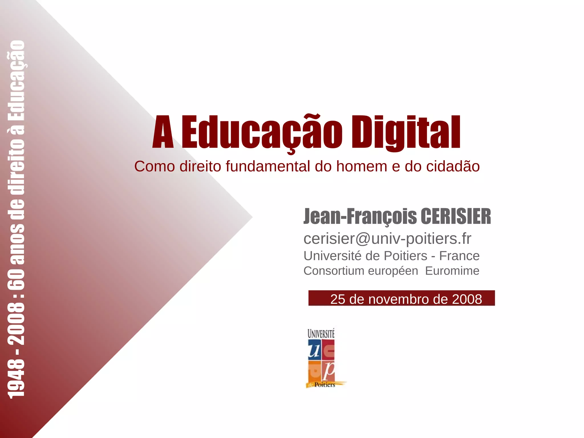 O documento discute 6 constatações sobre a educação digital nos últimos 60 anos: 1) a inovação pedagógica não acompanhou a introdução de novas tecnologias; 2) a cultura digital dos jovens se desenvolve fora da escola; 3) existe uma "fratura digital" entre gerações de alunos e professores; 4) as TIC contribuem pouco para combater o desinteresse dos alunos pela escola; 5) os professores se envolvem pouco com o uso educativo das TICs; 6) as TICs são usadas principalmente fora do