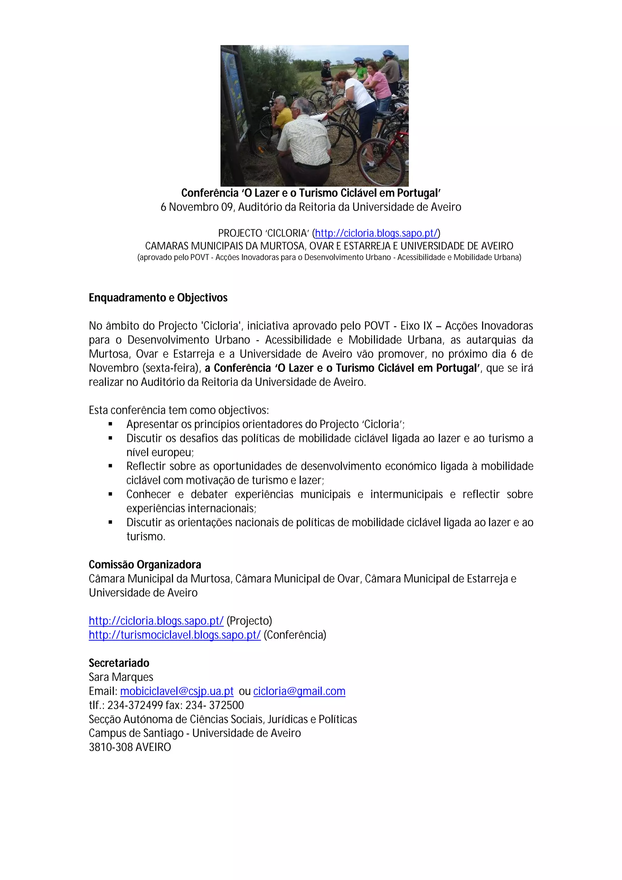 A conferência 'O Lazer e o Turismo Ciclável em Portugal' será realizada em 6 de novembro na Universidade de Aveiro para discutir o projeto 'Cicloria' e as políticas de mobilidade ciclável ligadas ao lazer e turismo em nível europeu e nacional. A conferência contará com painéis sobre inovação, experiências municipais e boas práticas internacionais.