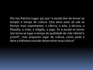 O documento discute o papel das bibliotecas escolares no desenvolvimento da leitura e da cultura dos estudantes. Descreve as atividades realizadas pela biblioteca escolar do Teixoso para promover a leitura, como exposições, encontros com autores e concursos. Apresenta dados mostrando que os alunos da escola tiveram desempenho acima da média nacional em exames e provas.