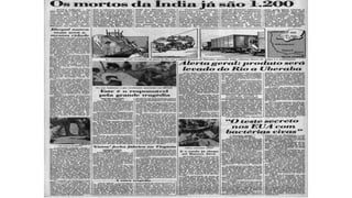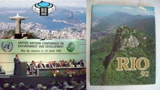 O documento discute conferências ambientais globais e desastres ambientais históricos. A primeira conferência global sobre meio ambiente foi realizada para conscientizar sobre a necessidade de desenvolvimento sustentável. Grandes desastres como Bhopal, Chernobyl e Fukushima causaram mortes e contaminação por décadas devido a acidentes industriais e nucleares.