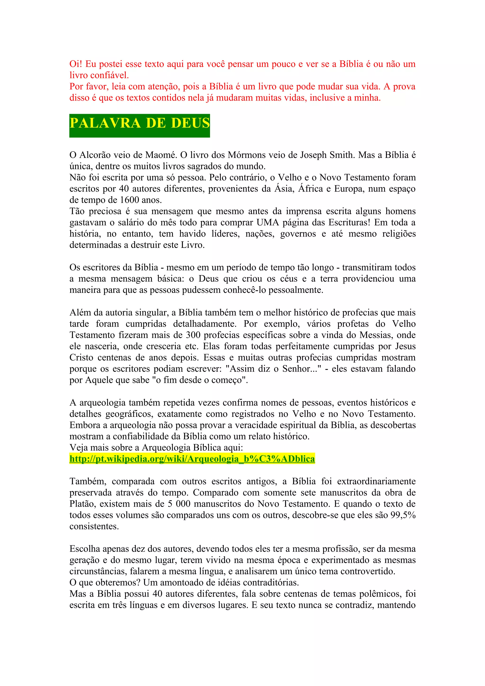 O texto apresenta argumentos para defender a confiabilidade da Bíblia como um livro inspirado por Deus, citando sua autoria por diferentes autores ao longo de 1600 anos, o cumprimento de profecias e a confirmação arqueológica de detalhes históricos narrados. Também menciona registros de Jesus em fontes não-bíblicas como Tácito, Josefo e Plínio o Jovem.