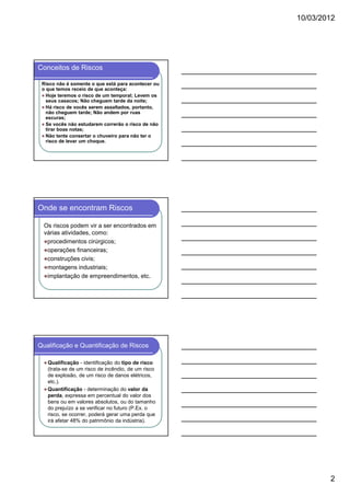 O documento discute conceitos de riscos ambientais e acidentes, incluindo a qualificação e quantificação de riscos e os custos associados. Também aborda estudos de confiabilidade para avaliar riscos de acidentes e exemplos históricos de acidentes ambientais catastróficos, como Bhopal.