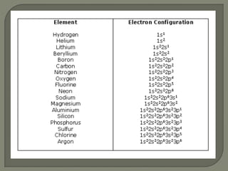 1) O documento discute a configuração eletrônica de átomos, incluindo a ordem de preenchimento das orbitais e a regra de Hund.