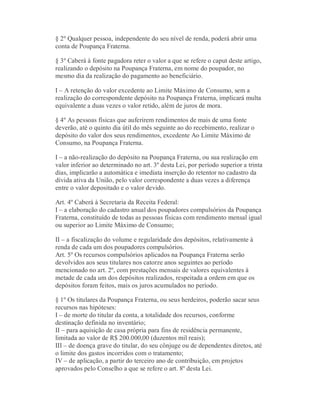 O documento descreve um projeto de lei que estabelece um limite máximo de consumo mensal para cada pessoa no Brasil. Qualquer renda acima desse limite seria depositada compulsoriamente em uma conta poupança especial chamada Poupança Fraterna. Os recursos seriam devolvidos gradualmente nos 14 anos seguintes. O projeto visa obter controle total das finanças dos brasileiros.