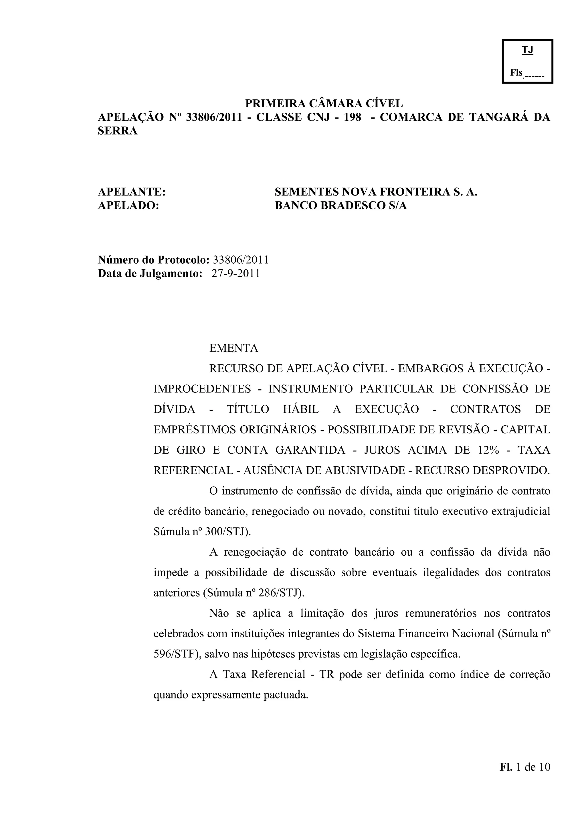 1) A apelante recorreu de sentença que julgou improcedentes os Embargos à Execução opostos contra o Banco Bradesco. 2) O documento executado era um Instrumento Particular de Confissão e Parcelamento de Dívidas originário de contratos de empréstimos anteriores. 3) O relator negou provimento ao recurso, reconhecendo a validade do título executivo e não verificando a alegada onerosidade excessiva nos contratos.