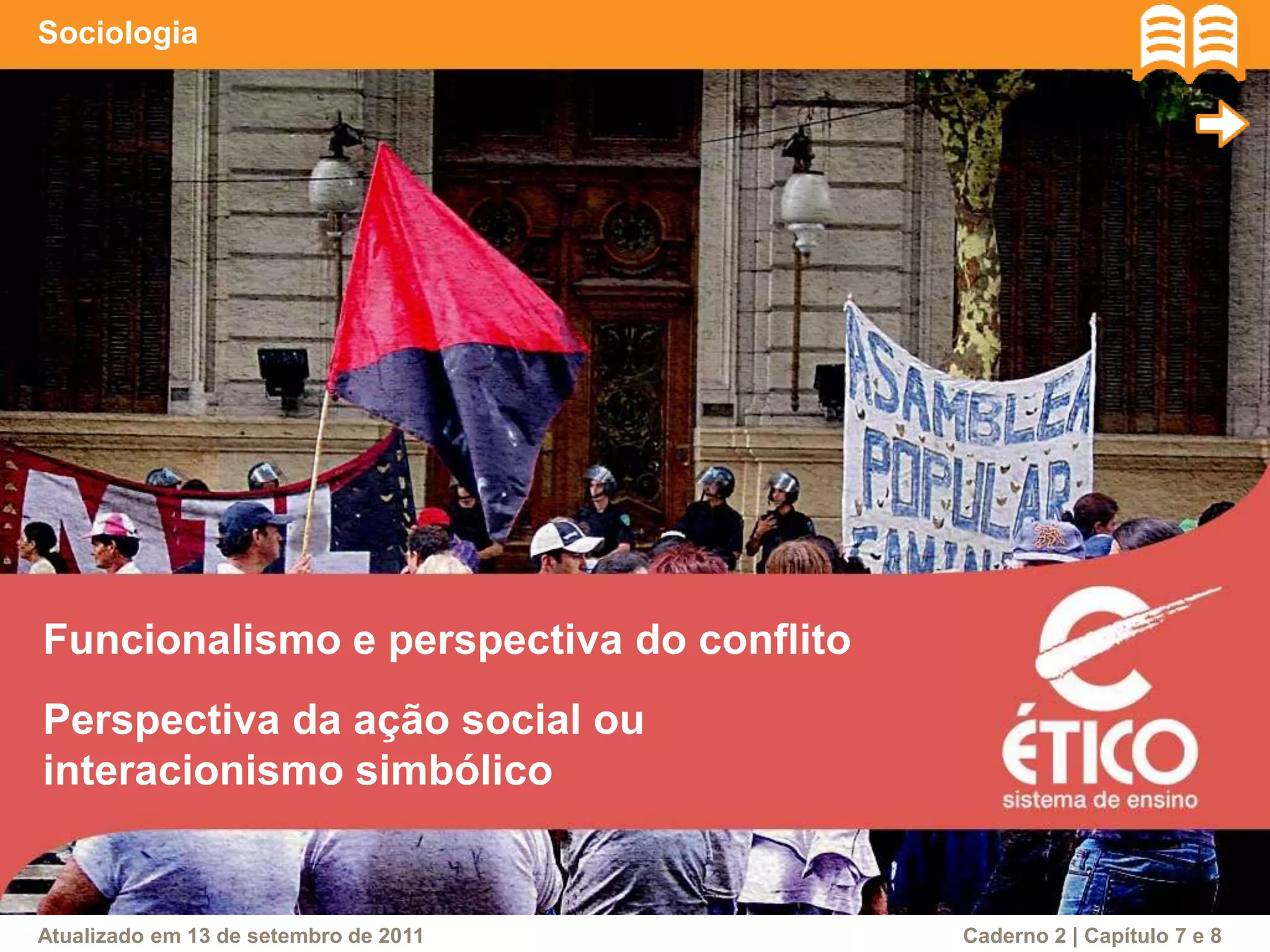 O documento discute diferentes perspectivas sociológicas, incluindo funcionalismo, teoria do conflito e interacionismo simbólico. Ele explora a ação social e as interações entre indivíduos, cultura e sociedade, bem como a influência de teóricos como Talcott Parsons e Robert Merton. Além disso, o texto aborda a estrutura social e conceitos como 'self' e 'habitus', examinando como as origens sociais moldam comportamentos e oportunidades.