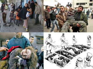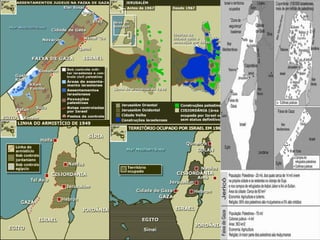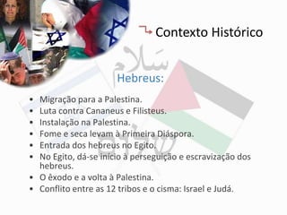 O documento descreve a história dos hebreus, judeus e árabes na Palestina, desde a migração dos hebreus até os dias atuais. Detalha os principais eventos do conflito israelense-palestino e as perspectivas dos dois lados. Também discute as intervenções internacionais, principalmente da ONU e EUA, e como a disputa pela terra continua causando violência entre israelenses e palestinos.