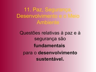 O documento discute como questões ambientais estão ligadas à paz, segurança e desenvolvimento. A pressão ambiental pode ser tanto causa quanto efeito de tensões políticas e militares. Além disso, a corrida armamentista consome recursos que poderiam ser usados para lidar com problemas ambientais, e a segurança ambiental requer cooperação internacional.