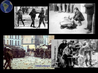 O documento descreve a história do conflito na Irlanda do Norte, começando com a conquista inglesa da Irlanda no século XII e a introdução do feudalismo. Ao longo dos séculos, os irlandeses sofreram discriminação e exploração, culminando na Grande Fome irlandesa de 1845-1849. No século XX, o movimento Sinn Féin lutou pela independência, resultando na partição da ilha em 1921. Conflitos entre nacionalistas irlandeses e unionistas britânicos continuam até hoje na