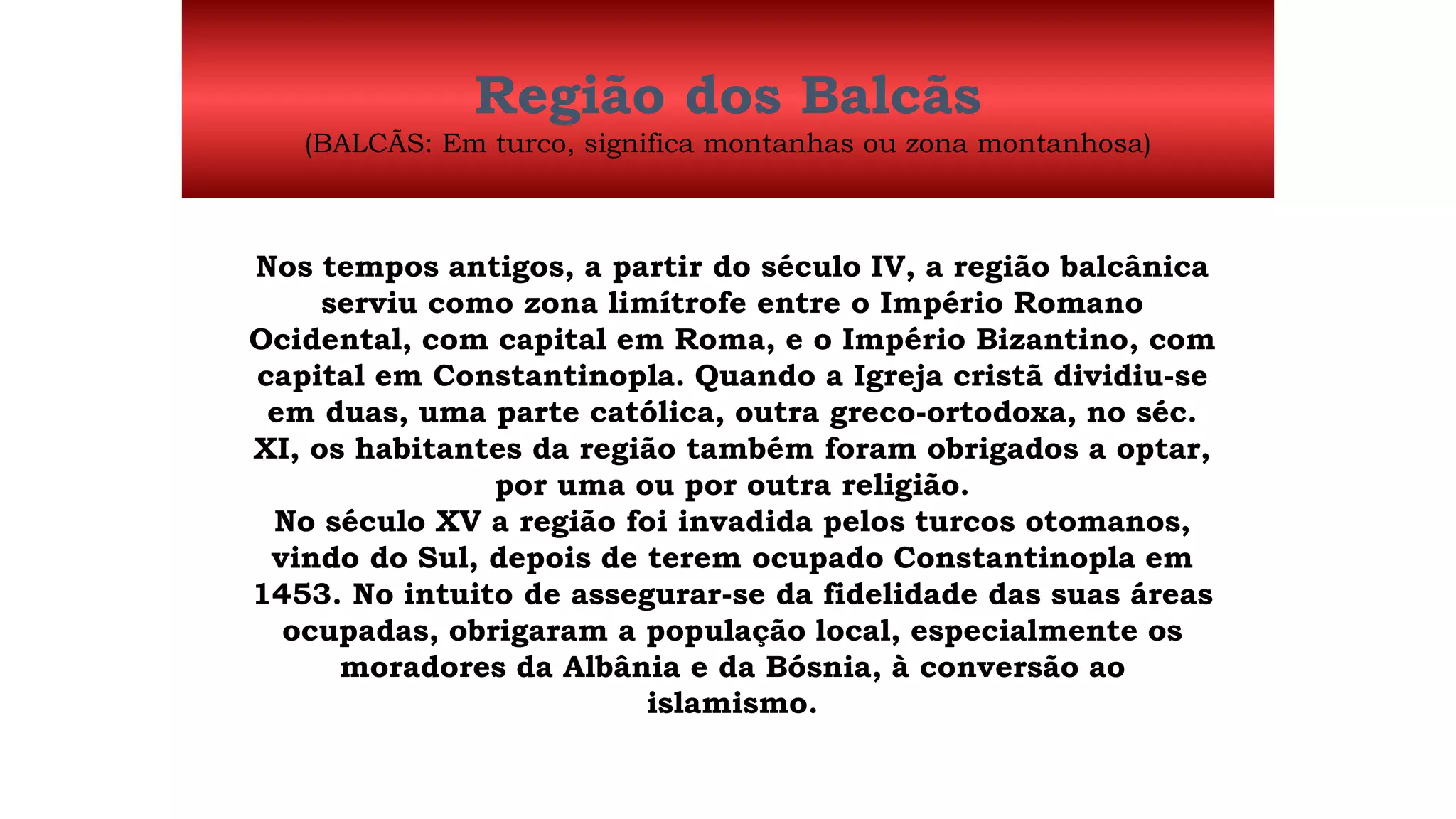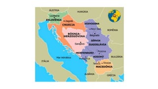 O documento descreve a história da região dos Balcãs, que serviu como zona de fronteira entre o Império Romano e o Império Bizantino. Mais tarde, a região foi invadida pelo Império Otomano e parte da população foi forçada a se converter ao Islã. No século XX, a Iugoslávia foi formada e depois desintegrada em guerras civis, levando à limpeza étnica e conflitos entre Sérvios, Croatas e outros grupos.